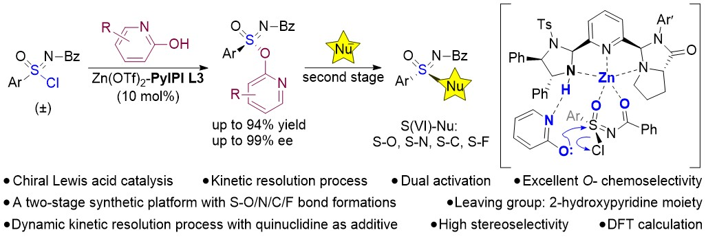 六价硫中心手性化合物广泛存在于药物分子和生物活性分子中,且其手性构建是不对称催化领域的挑战。该研究使用自主研发的手性三齿吡啶氮配体PyIPI,通过路易斯酸催化的不对称亲核取代反应,合成具有六价硫中心手性的亚砜亚胺酯。实验与理论计算研究表明,PyIPI配体具有双功能作用,既与路易斯酸络合经双齿配位活化氯代亚砜亚胺底物,又通过氢键活化亲核试剂。这一研究成果为构建六价硫中心手性提供了一种高效合成策略。