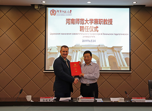 常俊标与库拉索福·谢尔盖 弗拉基米罗维奇共同签署了双方国际教育交流合作备忘录,为三位嘉宾颁发兼职教授聘任证书。随后,三位嘉宾与现场师生代表就美术领域相关科研问题进行了讨论,对各位师生提出的问题进行详细解答,对师生的专业发展提出了中肯建议。