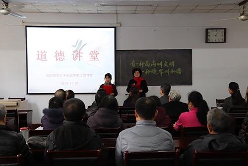 11月28日上午,由我校文明委主办、离退休职工管理处承办的第四十九期“道德讲堂”宣讲活动在老年大学举行。离退休职工管理处主要负责人及离退休代表50余人参加了本次活动。