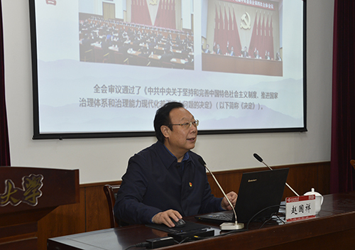 赵国祥以《深入学习贯彻党的十九届四中全会精神》为题,阐述了全会的基本情况和重要意义,介绍了《中共中央关于坚持和完善中国特色社会主义制度、推进国家治理体系和治理能力现代化若干重大问题的决定》起草的背景、过程和基本框架,并从四个方面重点解读了全会精神:要充分认识坚持和完善中国特色社会主义制度、推进国家治理体系和治理能力现代化的重大意义,这是实现“两个一百年”奋斗目标的重大任务,是把新时代改革开放推向前进的根本要求,是应对风险挑战、赢得主动的有力保证。要深刻领会中国特色社会主义制度和国家治理体系的显著优势,坚定中国特色社会主义制度自信。中国特色社会主义制度和国家治理体系具有深厚的历史底蕴,具有多方面的显著优势,具有丰富的实践成果。要准确把握坚持和完善中国特色社会主义制度、推进国家治理体系和治理能力现代化的总体要求、总体目标和重点任务,这些为新时代坚持和完善中国特色社会主义制度、推进国家治理体系和治理能力现代化指明了前进方向、提供了根本遵循。要加强党的领导,确保全会确定的各项目标任务全面落实到位。坚持和完善中国特色社会主义制度、推进国家治理体系和治理能力现代化,必须在党中央统一领导下进行,科学谋划、精心组织,远近结合、整体推进。