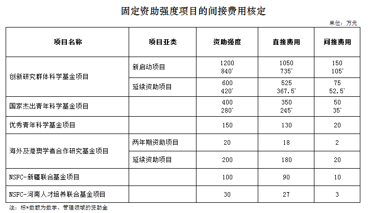 五、项目的间接费用一般按照《资金管理办法》规定的比例核定。对于实行固定资助强度的项目,按固定额度核定(具体见附表),其中的绩效支出预算,应依据经批准的项目直接费用预算,严格按照《资金管理办法》规定的方法计提。依托单位应认真审核项目设备购置费预算的必要性和可行性,严格控制设备购置支出,避免重复购置以至造成闲置、损失和浪费。