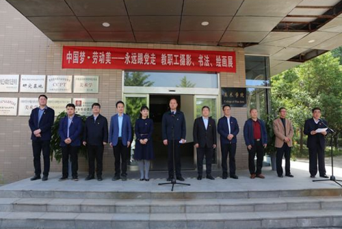 翰墨丹青歌盛世、风雨同舟颂党恩。为喜迎中国共产党建党100周年,4月28日,由校工会主办,美术学院承办,教职工书画协会、摄影协会协办的“中国梦·劳动美——永远跟党走” 摄影、书法、绘画展在美术学院一楼展厅开幕。校党委副书记、工会主席梅宪宾参加开幕式并致辞,美术学院、书画协会、摄影协会及教职工代表、学生代表参加开幕式并参观展览。开幕式由校工会副主席王俊杰主持。