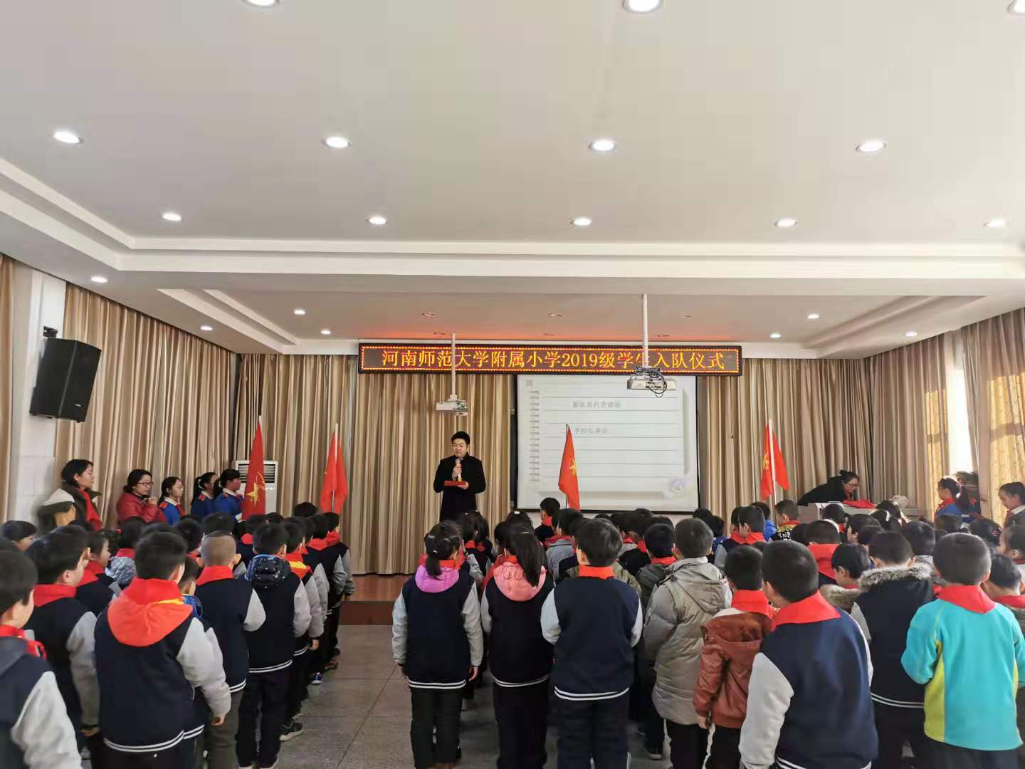 2019年12月27日,我校大队部隆重举行了一年级新生的入队仪式,一年级128名学生光荣地加入了中国少年先锋队组织。128名准备入队的一年级学生精神饱满,怀着欣喜和好奇,浑身充满着力量,唱起了响亮的《中国少年先锋队队歌》,六年级的大队干部们帮新生们佩戴红领巾,大队辅导员户老师授予中队旗。新队员们在红领巾的映衬下,个个神采奕奕,每个孩子的脸上洋溢着骄傲与自豪。