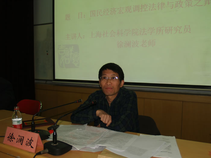 报告会上,首先法学院院长黄进才致欢迎词,并受学校委托宣布聘请徐澜波为兼职教授。接着,报告会开始,徐研究员先从宏观调控法的立法争议讲起,阐述了政策派认为宏观调控难以依法调控的理由。通过表述总结了宏观调控应该法律化的个人观点,并对主体和主体权力边界,调控的措施、前提和调控的程序等问题进行了详细的解说。报告期间,徐研究员知识渊博、思路清晰、分析深入浅出、讲解幽默,赢得了大家的阵阵掌声。结束后,徐研究员还与现场的学生进行互动交流,回答了学生提出的相关问题。