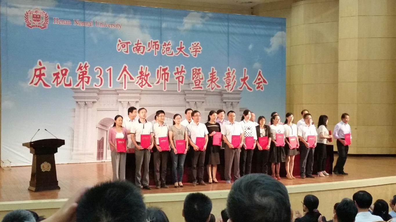 9月9日下午,我校庆祝第31个教师节暨表彰大会在音乐厅召开。会上,学校表彰了2014-2015学年获得各项荣誉的教师,我院牛琳、王守谦、马小能、杨翔宇老师受到表彰。其中,牛琳老师获得河南省高等学校师范教育专业毕业生教学技能大赛优秀辅导教师和2015年度河南省教学技能竞赛一等奖,王守谦、马小能、杨翔宇2015年度河南省教学技能竞赛一等奖。