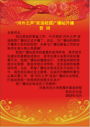 为营造浓郁的校园文化氛围,彰显办学特色,附属外国语学校“河外之声”双语广播站在全校师生的热烈期待中正式开播。广播站以弘扬社会主旋律、丰富校园文化生活、传播校园正能量、促进学生健康成长为宗旨,致力于为广大师生提供优质的广播服务。