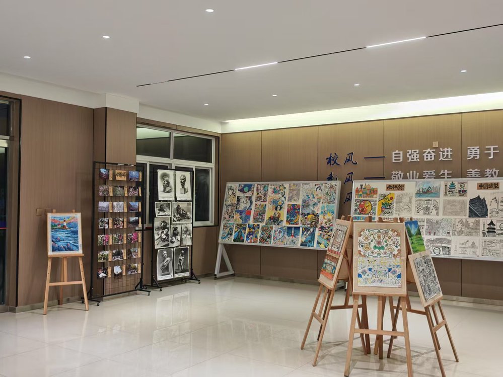 致精楼大厅的艺术展区宛如小型展馆,一幅幅书画作品风格各异,有的灵动飘逸,有的古朴典雅,吸引了众多师生驻足欣赏,为校园增添了浓厚的艺术氛围。遒劲有力的书法作品中,“书山有路勤为径” 的墨香与漫画故事里奇幻的校园故事相映成趣,创意中式古建速写以线条勾勒出飞檐翘角的精妙构造。师生在水墨丹青与光影构图间流连,感受着艺术创作中流淌的校园情怀与青春创意。