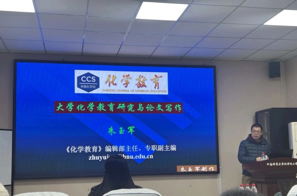2025年11月14日上午,核心期刊《化学教育》专职副主编、编辑部主任朱玉军博士应邀为我院作题为《大学化学教育研究与论文写作》的专题讲座。讲座由赵茜怡院长主持,广大师生积极参加并展开深入交流。