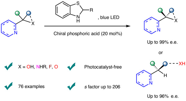 EDA复合物是一个电子给体和一个电子受体通过非共价键作用形成的基态复合物。借助其独特的光吸收特性,EDA复合物策略已成为一种重要的光化学合成平台。然而,由于复合物形成条件(如化学计量比限制)和手性催化体系构建的困难,基于EDA复合物的不对称合成研究进展缓慢,尤其是利用该类复合物实现动力学拆分的方法迄今未见报道。该研究创新性地采用手性磷酸催化剂与外消旋底物(如醇、胺、氟化物和环氧乙烷)形成催化型EDA复合物,在可见光激发下实现对某一对映体的优先活化,进而发生单电子还原和对映选择性碳氢键构建,最终完成动力学拆分。该方法无需使用光敏剂,具备原子经济性高、反应条件温和、底物适用性广等优势。研究团队系统评估了多种含氮杂环醇、胺、氟化物以及环氧乙烷的拆分效果,均可以高对映选择性(e.e.值最高达99%)获得剩余底物及相应产物。该方法还可用于传统手段难以制备的三芳基取代叔醇和含氟/胺季碳手性分子的高效构建,显示出在药物分子合成中的广阔应用前景。