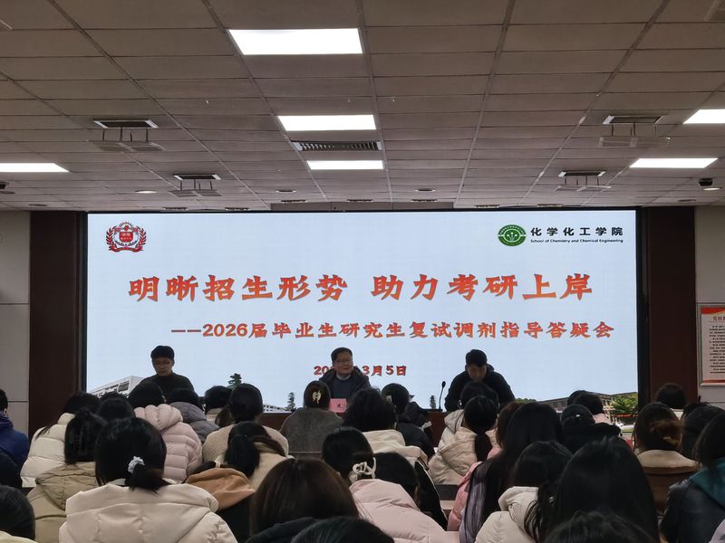 为帮助2026届毕业生精准把握考研复试与调剂关键节点,明晰招生形势,全力助力上岸,3月5日晚,我院在化学北楼五楼会议室召开“明晰招生形势 助力考研上岸”2026届毕业生研究生复试调剂指导答疑会。院党委副书记朱进、校团委副书记曹锟、2022级本科生辅导员及230余名2026届考研学生参加会议,会议由2022级本科生辅导员恽程主持。