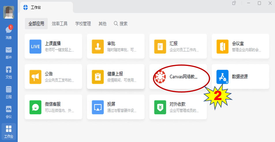 2、企业微信上,点击“工作台”,找到“Canvas教学管理平台”。