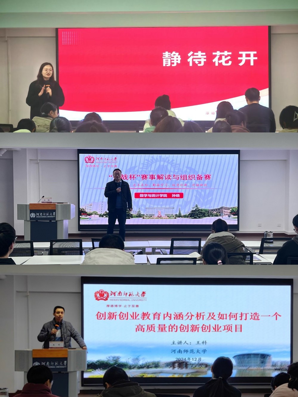 在竞赛指导工作培训中,数学与统计学院副院长孙晓讲授了“挑战杯”大学生课外学术竞赛项目管理的相关知识,使学生系统掌握了竞赛项目的规划、执行、监控和收尾的全过程,以及相关学术研究的工具和使用技巧。招生就业处王科就“创新创业教育的内涵及如何打造一个高质量的创新创业项目”进行系统讲授,帮助学生充分了解“中国国际大学生创新大赛”的竞赛要求和流程,提升项目选题、项目策划、团队合作、市场调研等各项能力,为未来取得良好的竞赛成绩奠定基础。