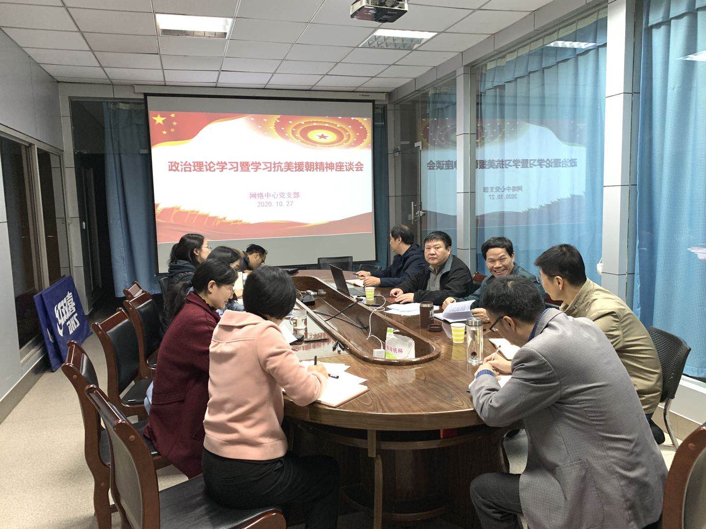 10月27日下午,网络中心党支部在琢玉楼三楼会议室开展政治理论学习座谈会,会议由党支部书记朱守宏主持。全体党员教职工参加会议,范黎林主任及班子成员参加了学习。