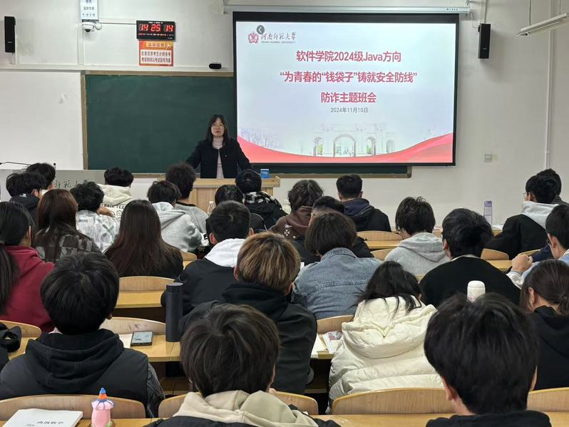 为进一步增强同学们的反诈骗安全意识,提高防范诈骗的能力,在双十一购物节来临之际,2024级软件工程Java方向于11月10日在向真楼组织开展“为青春的“钱袋子”铸就安全防线”主题班会,班会由辅导员叶娅主持,2024级软件工程Java方向全体学生参加。