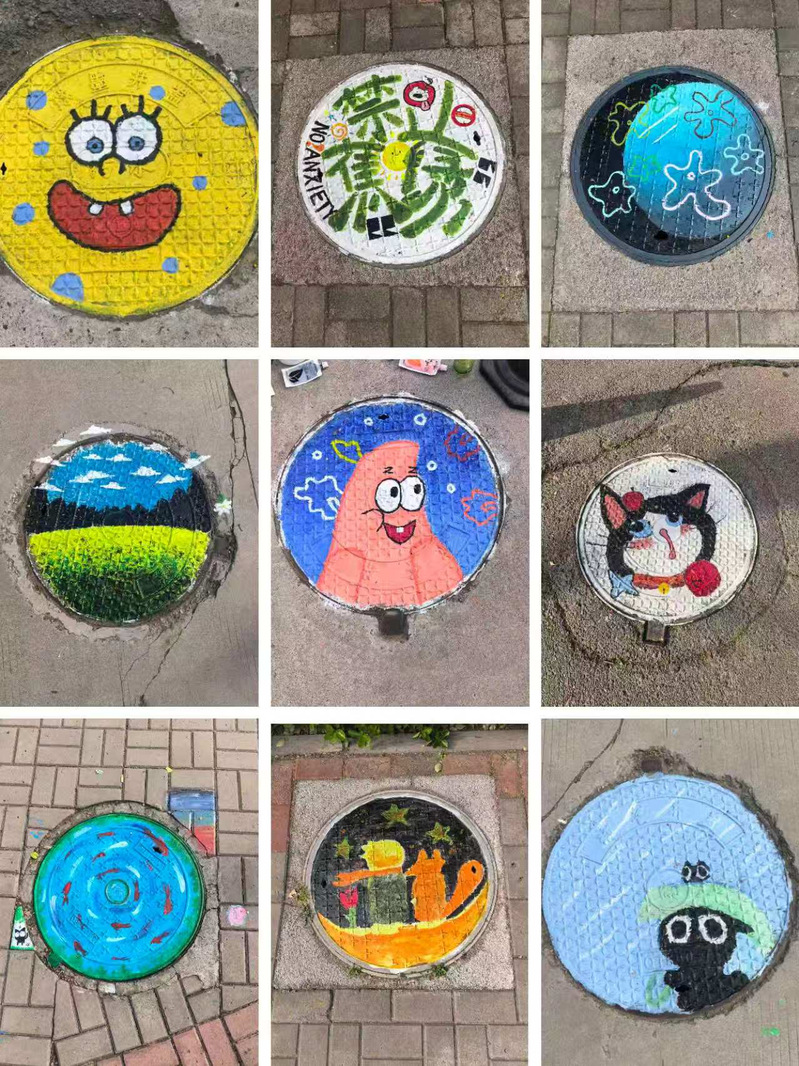同学们围绕积极健康的构图思路,色彩和谐、生动有趣,在自主筹备中展现出饱满热情与积极认真的态度。同学们相互配合、默契协作,从颜料调配到线条勾勒,每一步都细致认真,用画笔为冰冷的井盖赋予生机和活力。