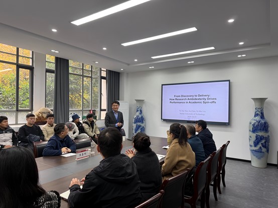 10月27日上午,大连理工大学孙玉涛教授应邀为学院骨干教师和研究生代表50余人,作了题为“From Discovery to Delivery: How Research Ambidexterity Drives Performance in Academic Spin-offs”的专题报告。商学院副院长王喜刚教授、副院长海本禄教授出席,海本禄主持。