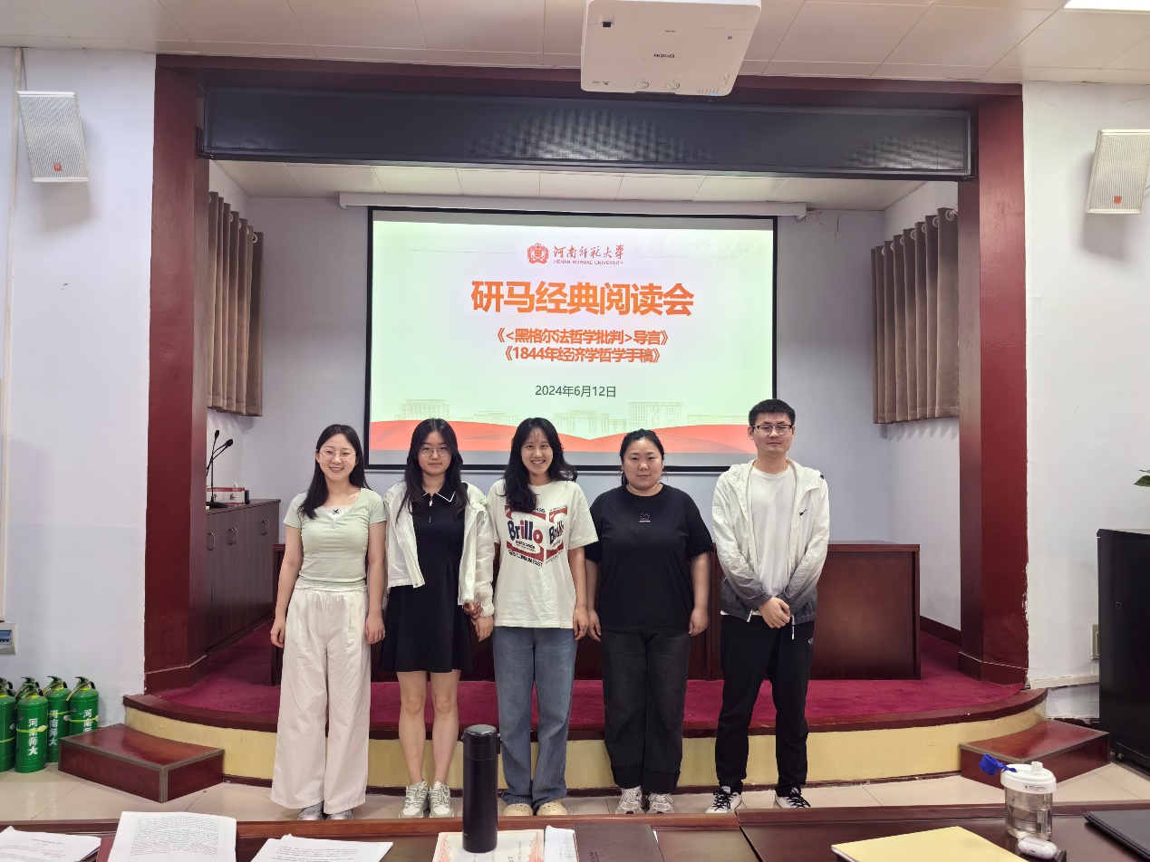 习近平总书记曾说:“要反复读,用心读,要把马克思主义原著‘厚的读薄,薄的读厚’”。为进一步加强理论学习,深入感悟历史唯物主义的力量,更好的悟规律、明方向、增智慧、学方法6月12日上午,以历史唯物主义为线,探马克思主义真理之光阅读小组在平原楼108教室举办了以“历史唯物主义的萌芽”为主题的组内第一次阅读分享会。本次阅读分享会以《1844年经济学哲学手稿》《<黑格尔法哲学批判>导言》两本经典著作为研读内容,全体小组成员参加此次阅读分享交流会,将所思、所想、所感进行组内分享讨论。