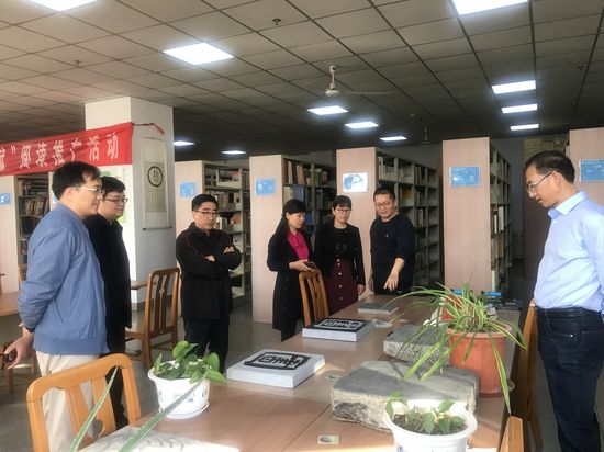 在图书馆新乡地方文献中心展厅,胡世巧一行了解了抗战文献展的每一件展品,追忆抗战胜利75年来祖国取得的巨大变化,回忆展品所反映的烽火岁月。在地方文献书库,地方文献中心负责人马洪良博士向胡世巧一行汇报了我馆新乡地方文献特色馆藏建设情况,介绍了“金石传拓技艺传习”活动开展、新乡地方史志等地方文献的收藏和利用情况等。