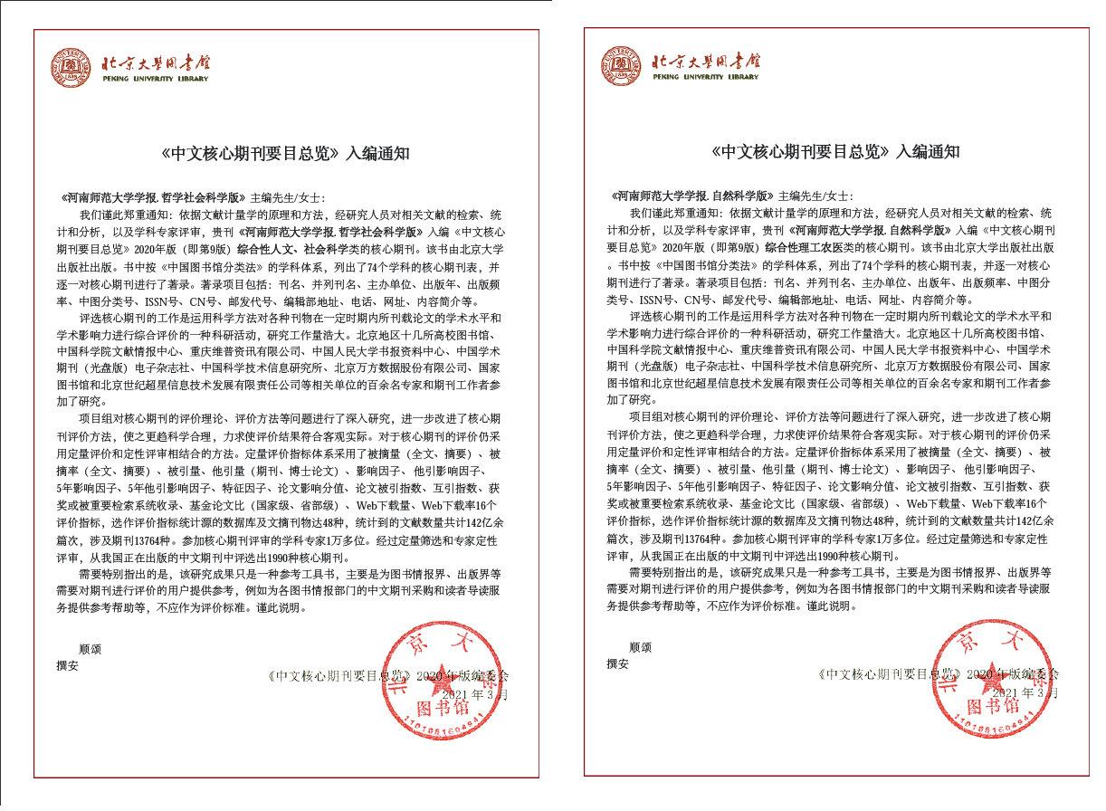 近日,《中文核心期刊要目总览》2020版编委会发来入编通知,我校学报哲学社会科学版和自然科学版分别入编综合性人文、社会科学类和综合性理工农医类核心期刊。这是我校学报哲学社会科学版连续第7次、自然科学版连续第6次入编《中文核心期刊要目总览》。