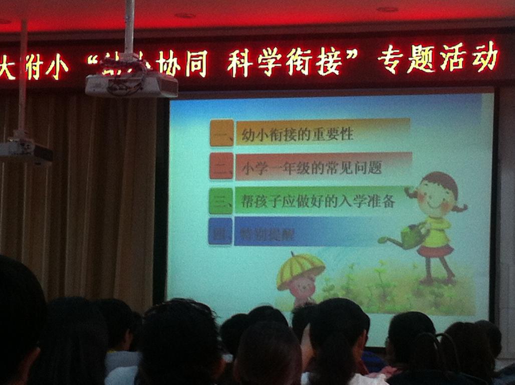 经幼儿园和师大附小领导班子友好协商,2016年6月16日下午四点,幼儿园组织百余名大班幼儿家长到师大附小四楼多功能厅参加了“幼小衔接”主题家长会,附属小学赵金红副校长从“幼小衔接”的重要性、一年级常见问题、帮助孩子做好入学准备、学习习惯的培养四方面为家长做了详细、认真的剖析,一个小时的专题讲座让家长进一步明确了如何帮助孩子顺利进入小学、如何帮助孩子尽快适应小学生活、如何帮助孩子养成良好的学习习惯,与会的家长认真倾听,进一步认识到家长配合的重要性。