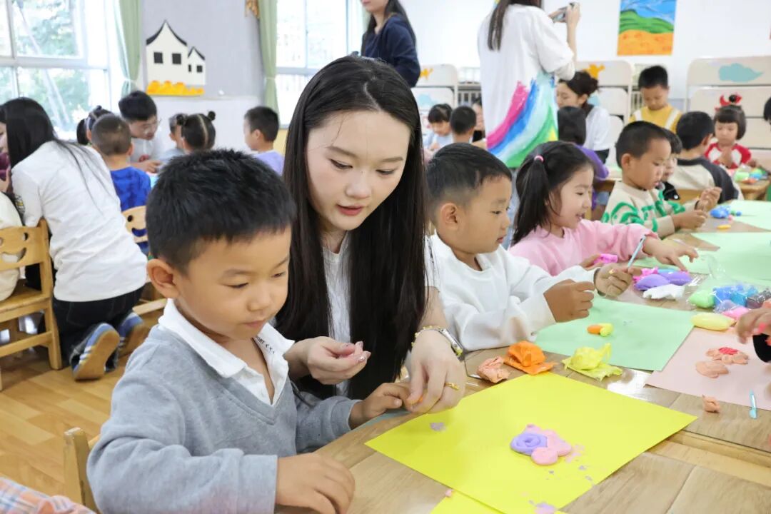 活动伊始,幼儿园党支部书记、园长常利芹致欢迎辞,感谢美术学院一直以来对幼儿园的支持与帮助,希望继续加强与高校的融合互动,为孩子创造更加多元的学习体验。互动环节中,大学生和孩子们用彩泥制作了“会开花的植物”“有翅膀的小昆虫”。在揉圆、搓长的技巧中,进行设计创造。将科普知识与艺术魅力同步绽放。看着孩子们手中形态各异的美术作品,大家脸上露出喜悦的笑容。