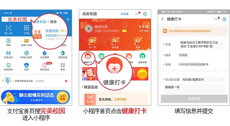 支付宝搜索“完美校园”小程序→选择我校→点击“健康打卡”→按要求选择院系及个人信息进行打卡。(如有问题,请经各学院辅导员上报至相关微信群咨询解决)