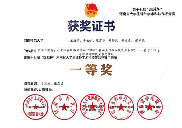 近日,第十七届“挑战杯”河南省大学生课外学术科技作品竞赛结果正式揭晓。学院学子踊跃参赛、奋勇争先,凭借扎实的专业功底与突出的创新能力斩获佳绩,共4个项目脱颖而出荣获省级奖项,其中一等奖2项、二等奖1项、三等奖1项,充分展现了政管学子在学术科研与实践创新领域的过硬实力。